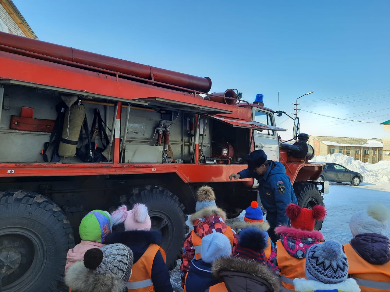 Дети получили огромный заряд положительных эмоций от экскурсии в пожарную часть. Узнали, что в этой машине есть насос, благодаря которому водитель может подать воду даже из открытого водоема.