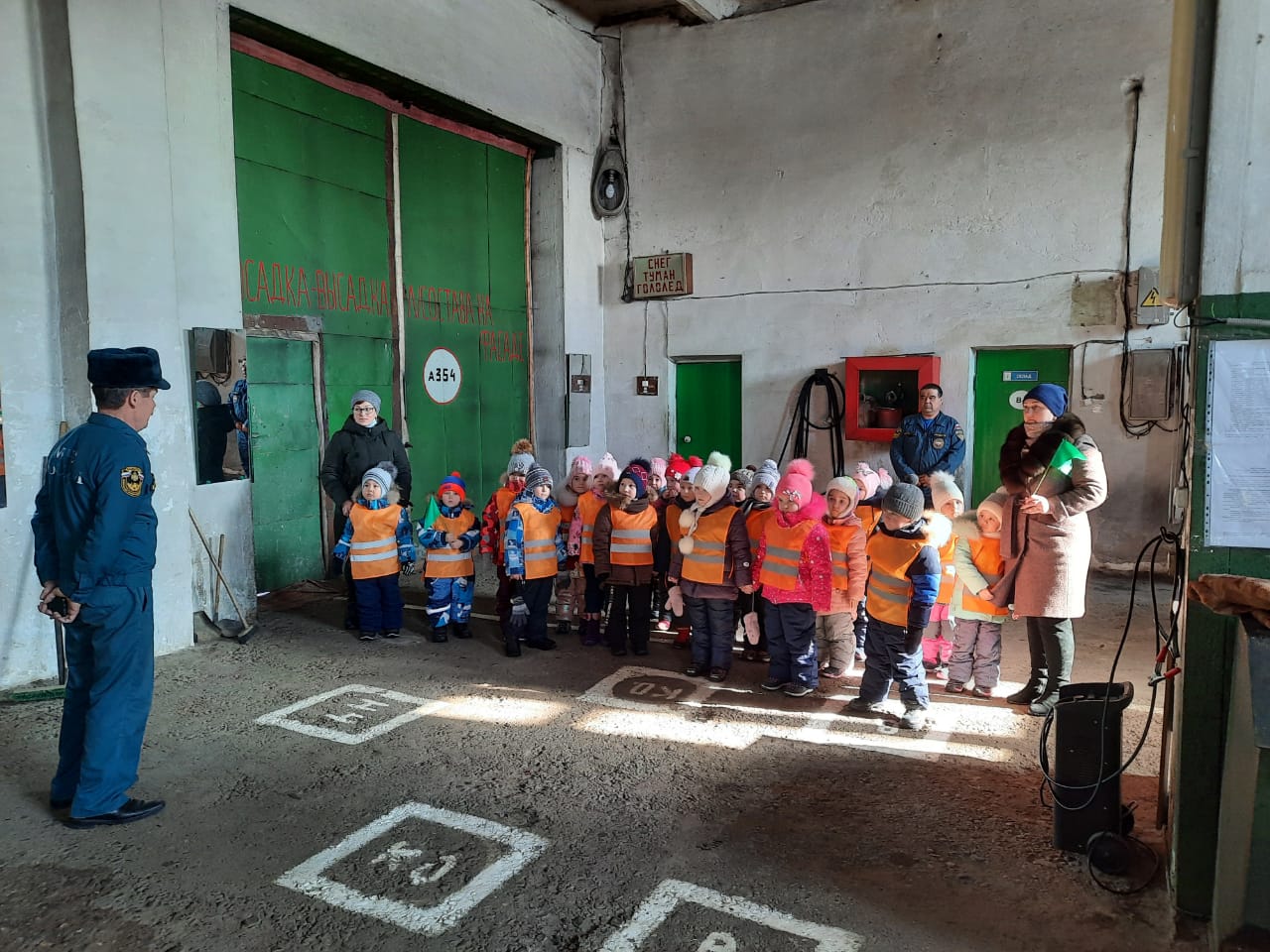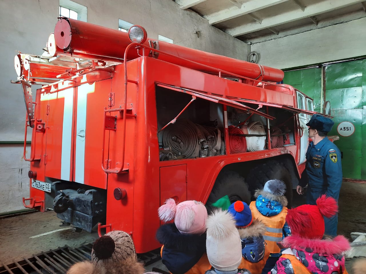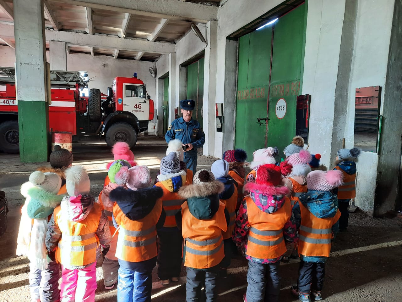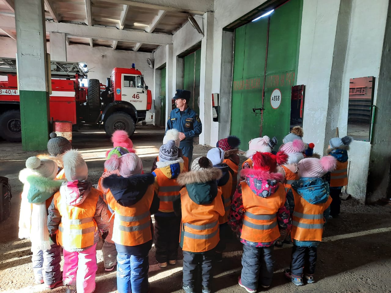 Беседу с детьми провел зам начальника ОППЧ-84 Гайсин Раян Сагитович. Экскурсия воспитанников группы «Тюльпанчик» началась с диспетчерской пожарной части, куда поступают тревожные звонки. Сотрудники пожарной части побеседовали с детьми, познакомили их со специальной одеждой пожарного. Далее в сопровождении Гайсина Р.С. дети отправились в гараж, где с огромным удовольствием и восхищением рассматривали пожарные машины, аварийно – спасательное оборудование. Ребята увидели пожарный рукав и другие, столь нужные спасателям инструменты на пожаре, узнали об их назначении. А также познакомились со спасательным аппаратом, который используют в задымленных местах. С восторгом ребята примерили шлем, рассмотрели пожарные машины, услышали звук сирены. Многие пожелали «примерить на себя» профессию пожарного: посидеть за рулем, ощутить себя бесстрашным пожарным.