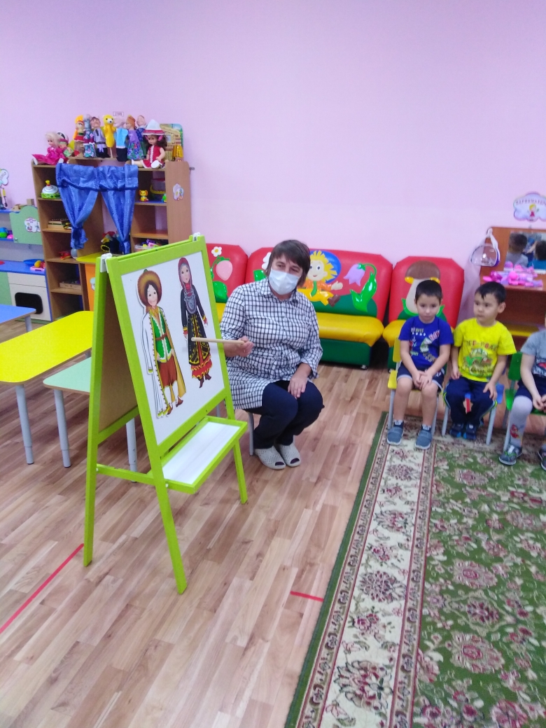 С интересом дети рассматривают предметы башкирской национальной одежды. Свои впечатления дети стараются отобразить на занятии по рисованию при раскрашивании моделей башкирской одежды.