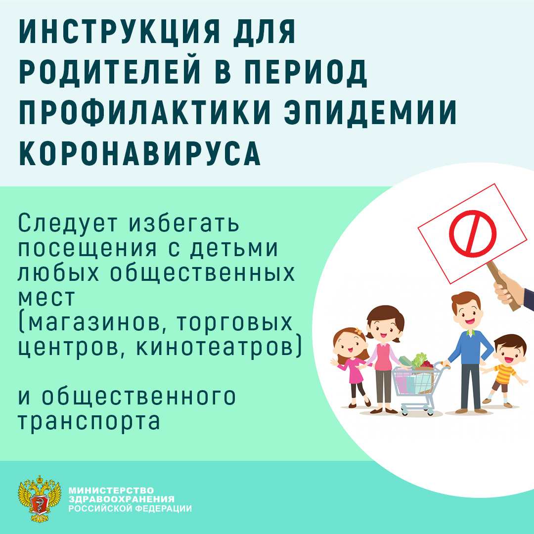 4. По возможности следует избегать посещения с детьми любых общественных мест: учреждений, мест общественного питания, торговли, образовательных и развлекательных центров, а также других мест общественного пользования (магазинов, кинотеатров, торговых центров и т. д.). Избегайте с детьми любых массовых скоплений людей.