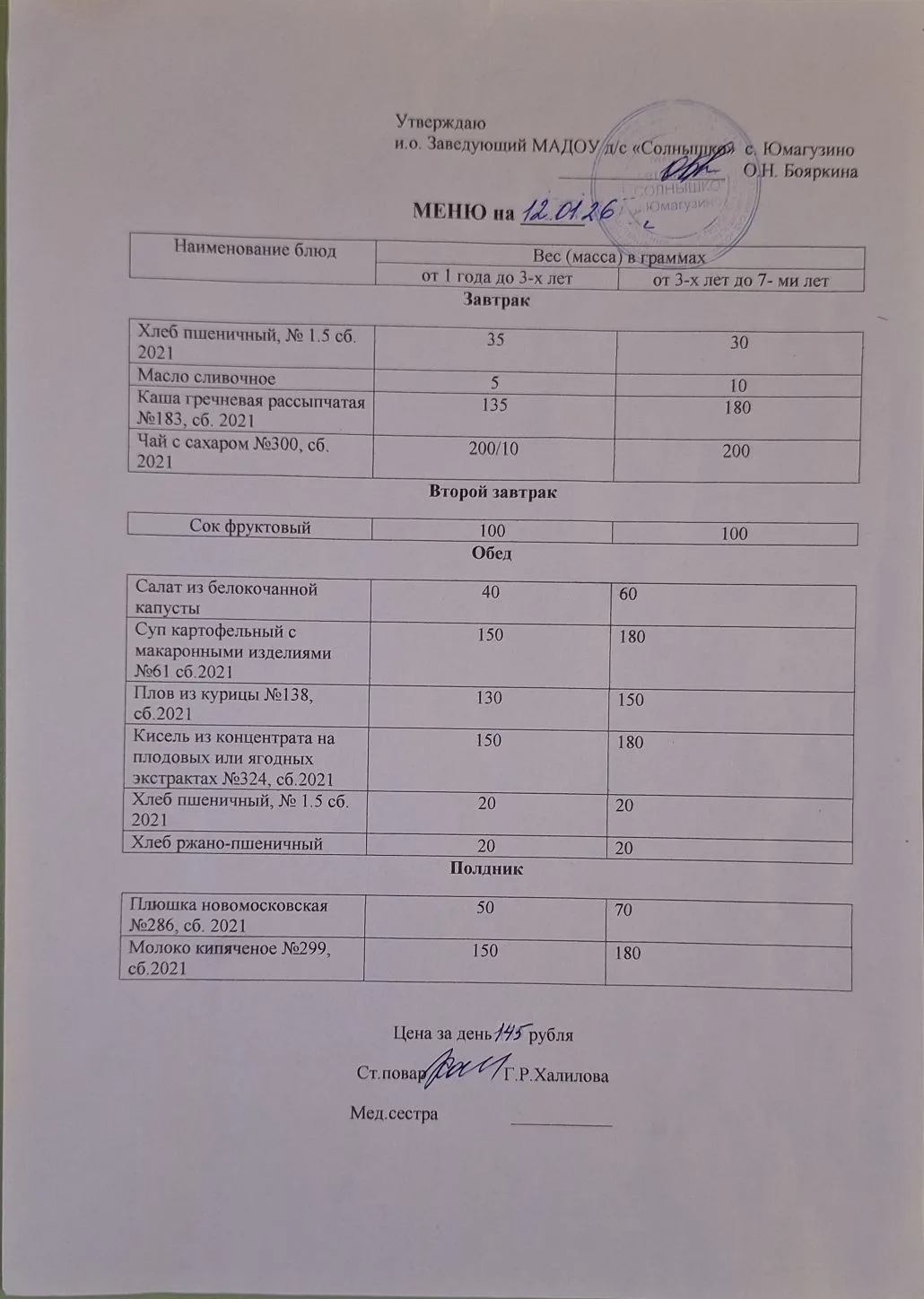 Организация питания в МАДОУ детский сад «Солнышко» с. Юмагузино