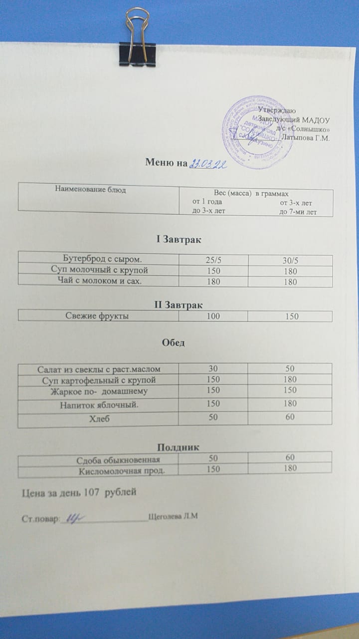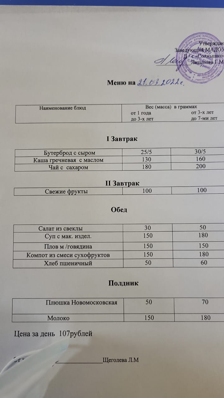 Организация питания в МАДОУ детский сад «Солнышко» с. Юмагузино
