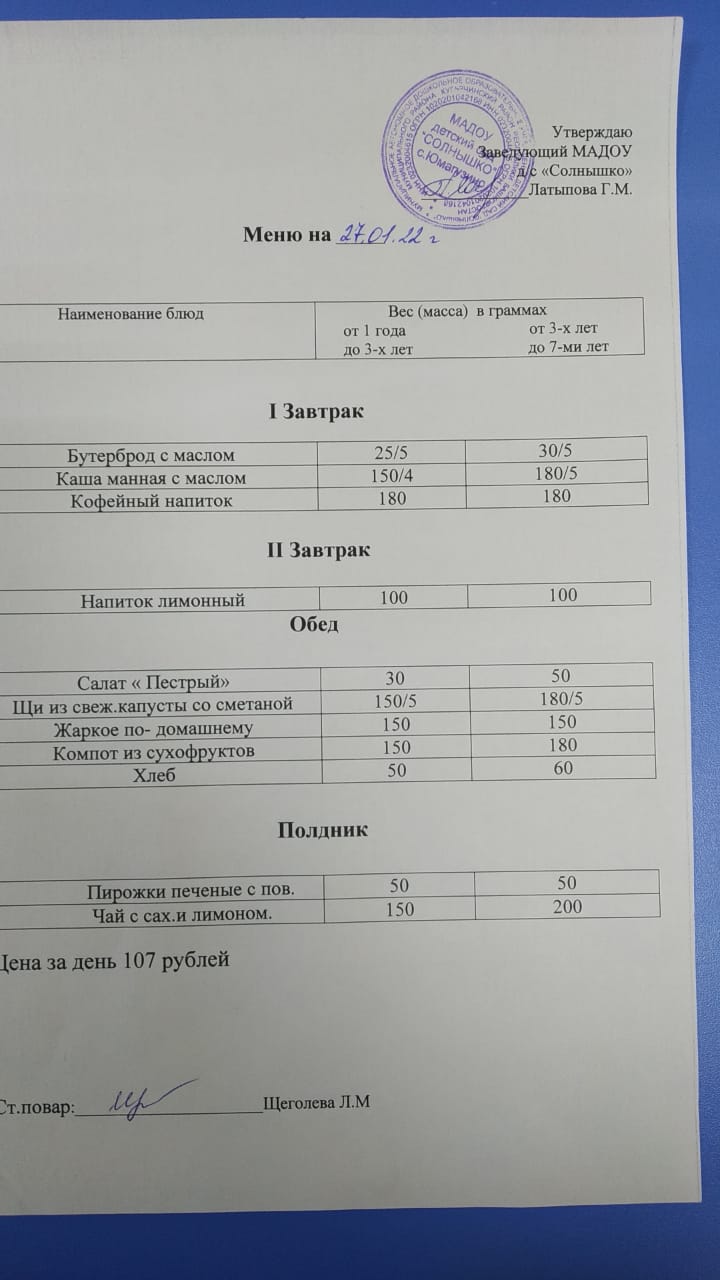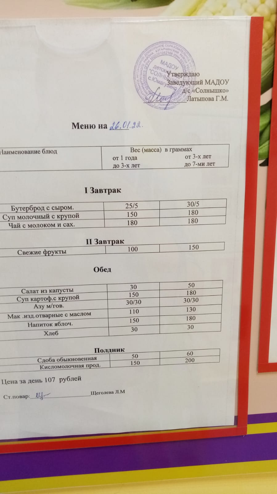 Организация питания в МАДОУ детский сад «Солнышко» с. Юмагузино