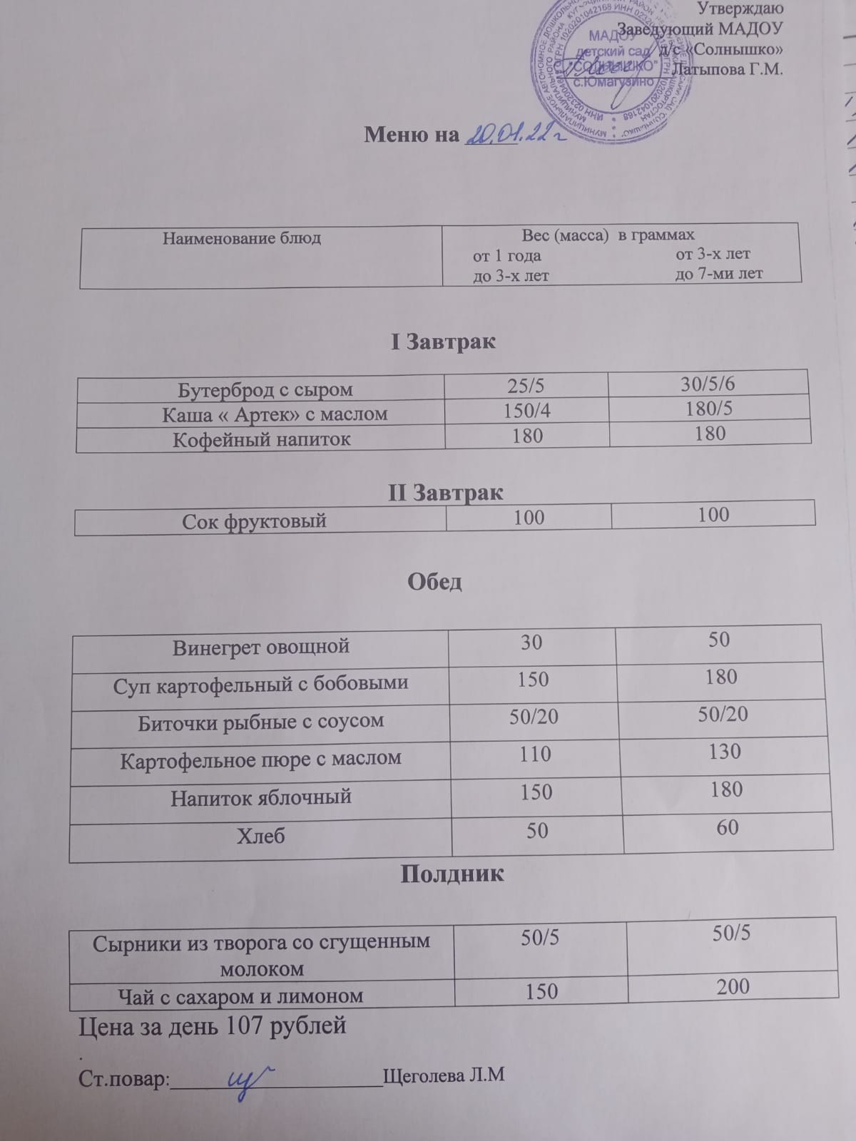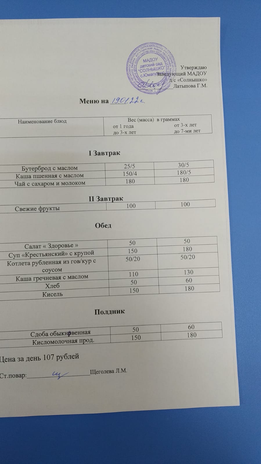 Организация питания в МАДОУ детский сад «Солнышко» с. Юмагузино