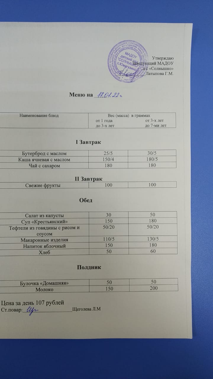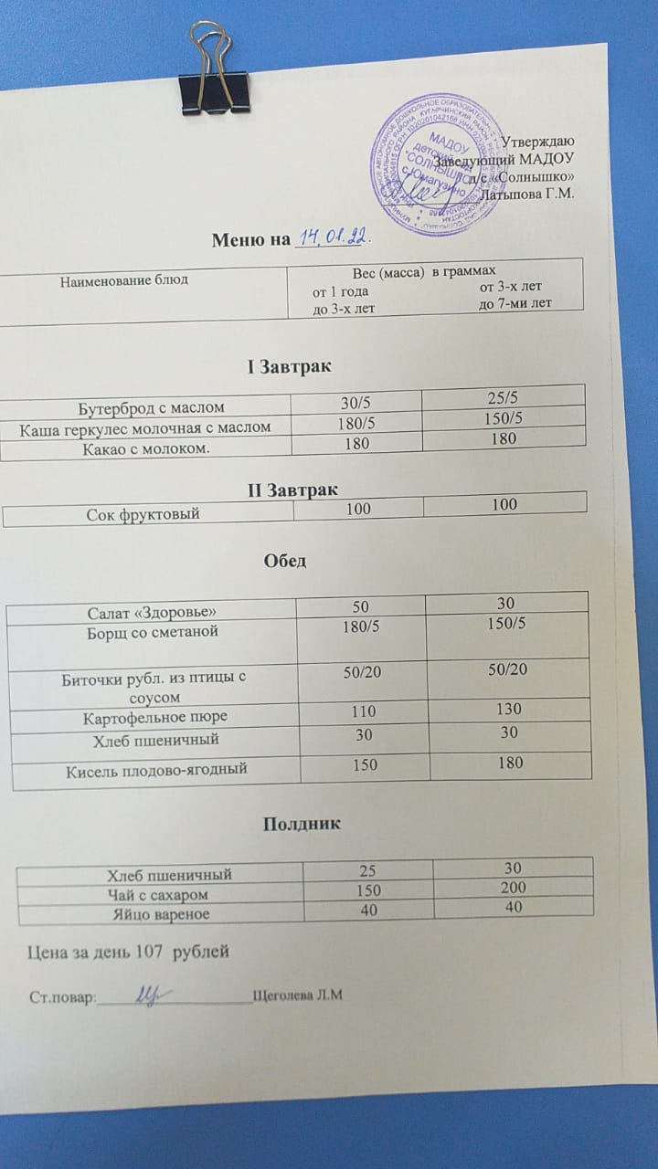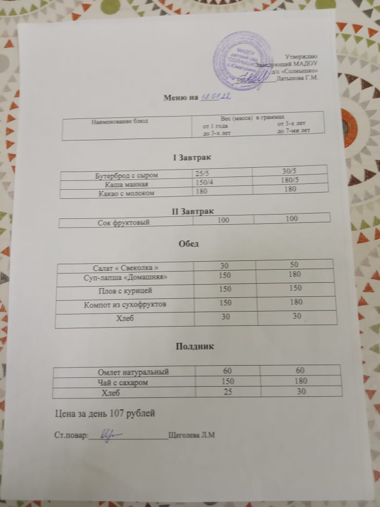 Организация питания в МАДОУ детский сад «Солнышко» с. Юмагузино