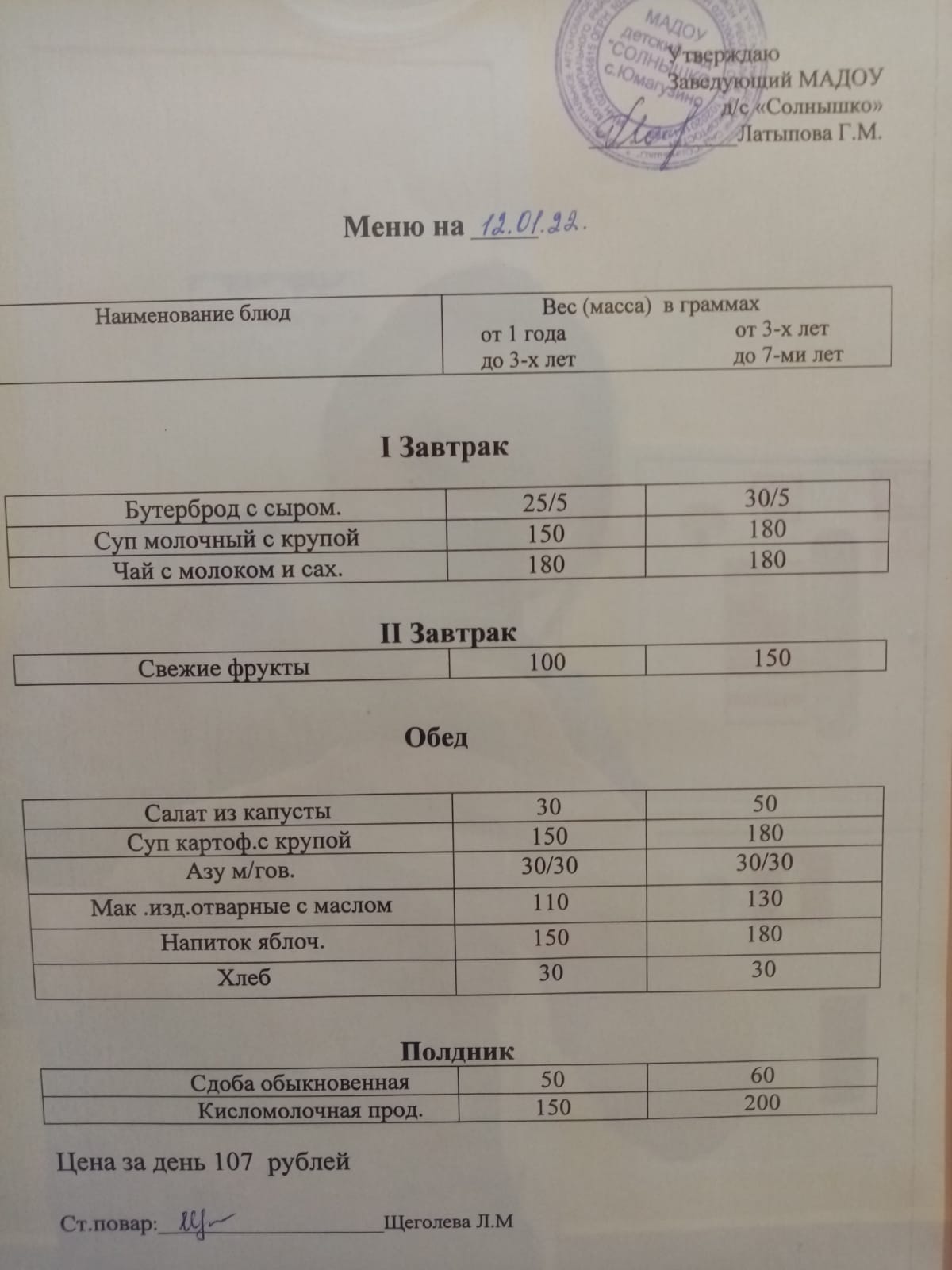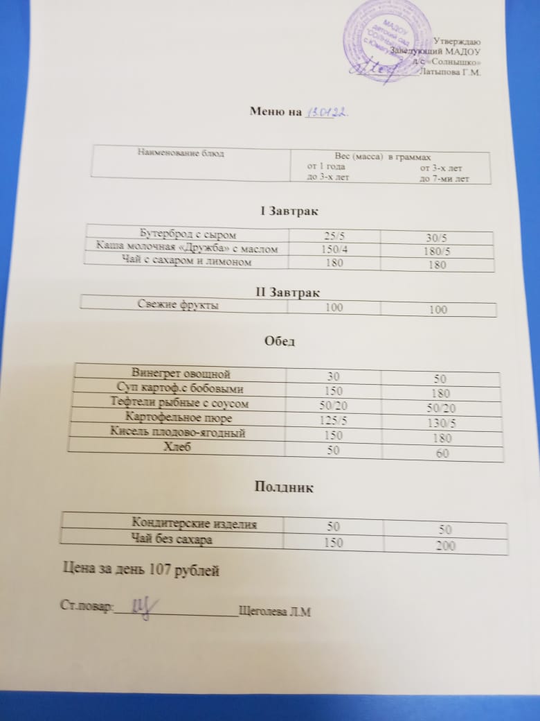 Организация питания в МАДОУ детский сад «Солнышко» с. Юмагузино