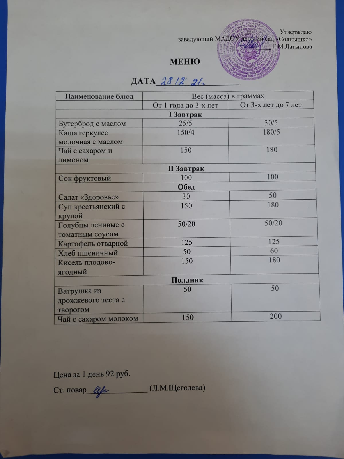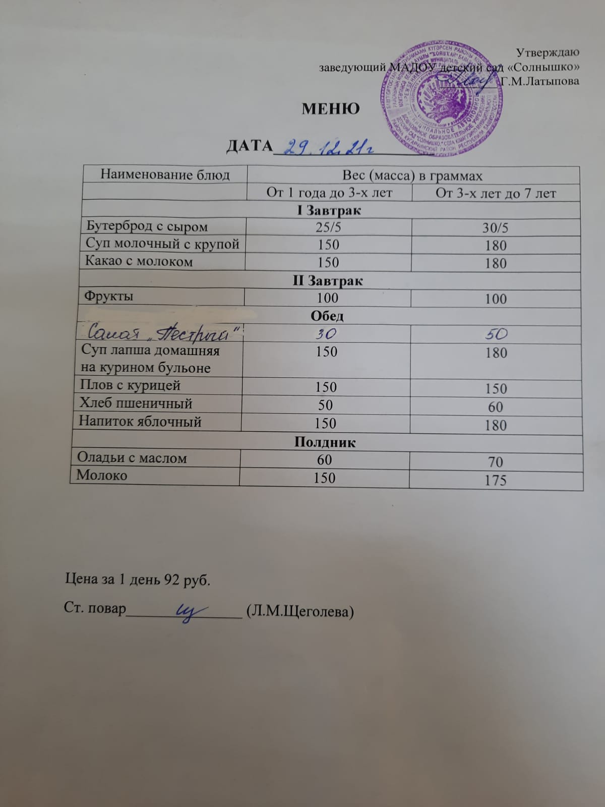 Организация питания в МАДОУ детский сад «Солнышко» с. Юмагузино