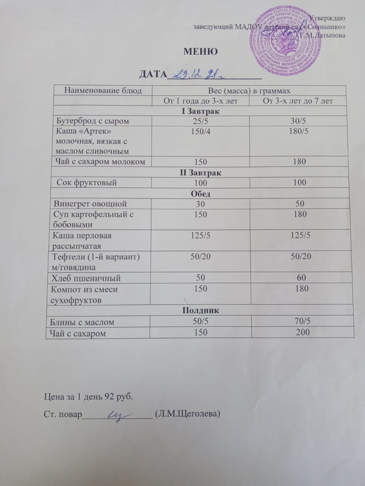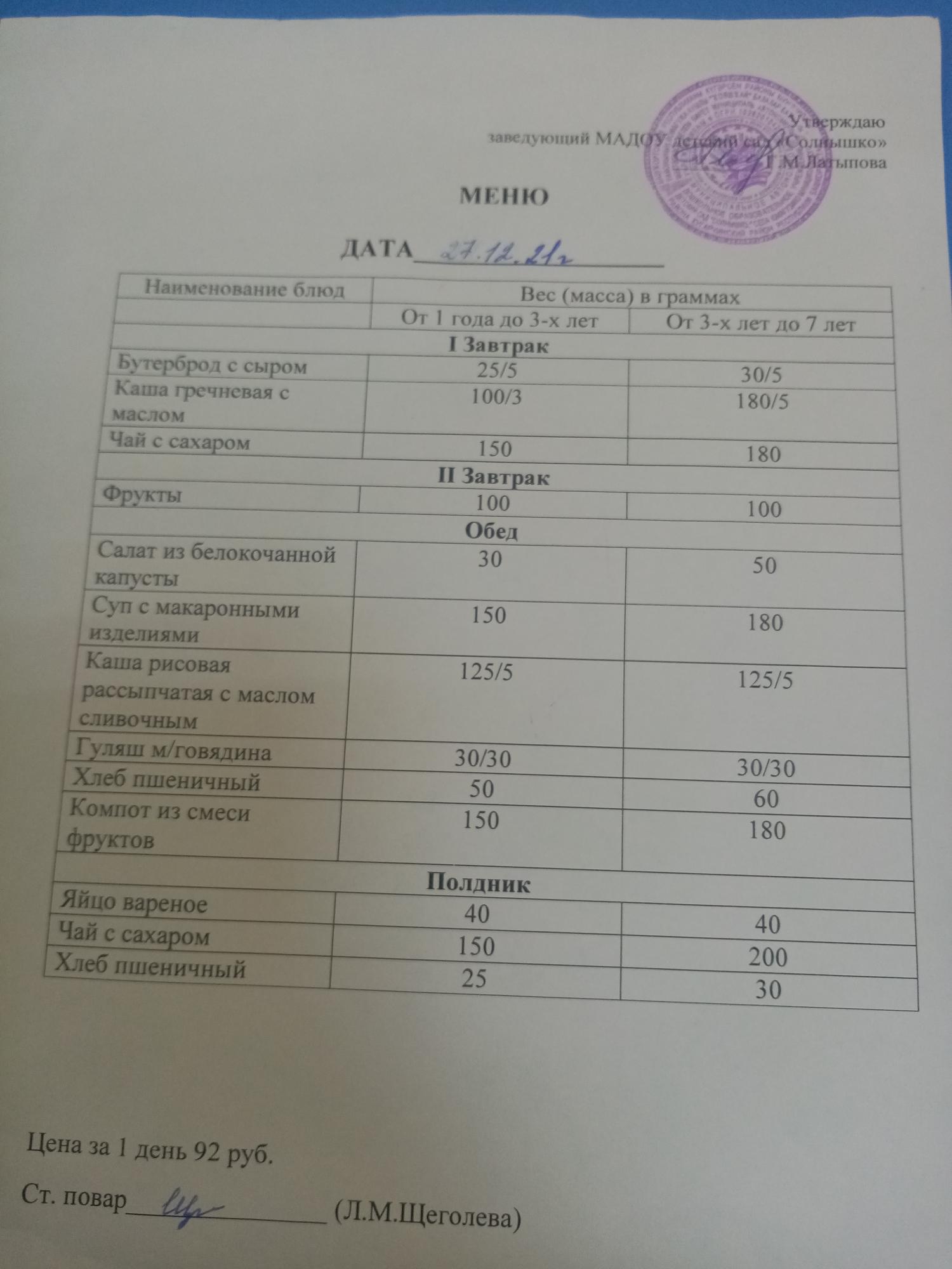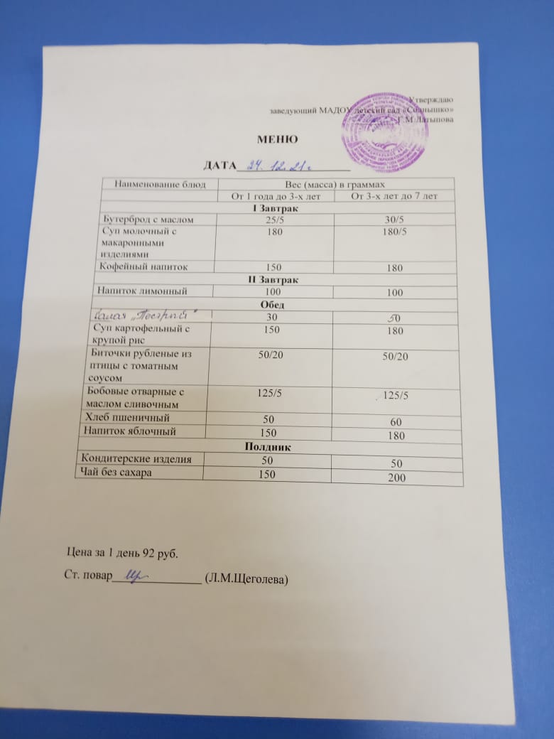 Организация питания в МАДОУ детский сад «Солнышко» с. Юмагузино