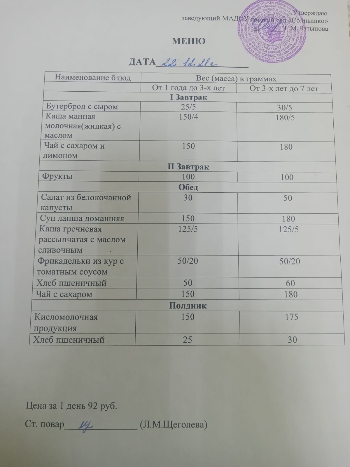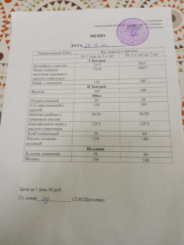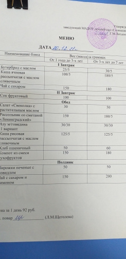 Организация питания в МАДОУ детский сад «Солнышко» с. Юмагузино