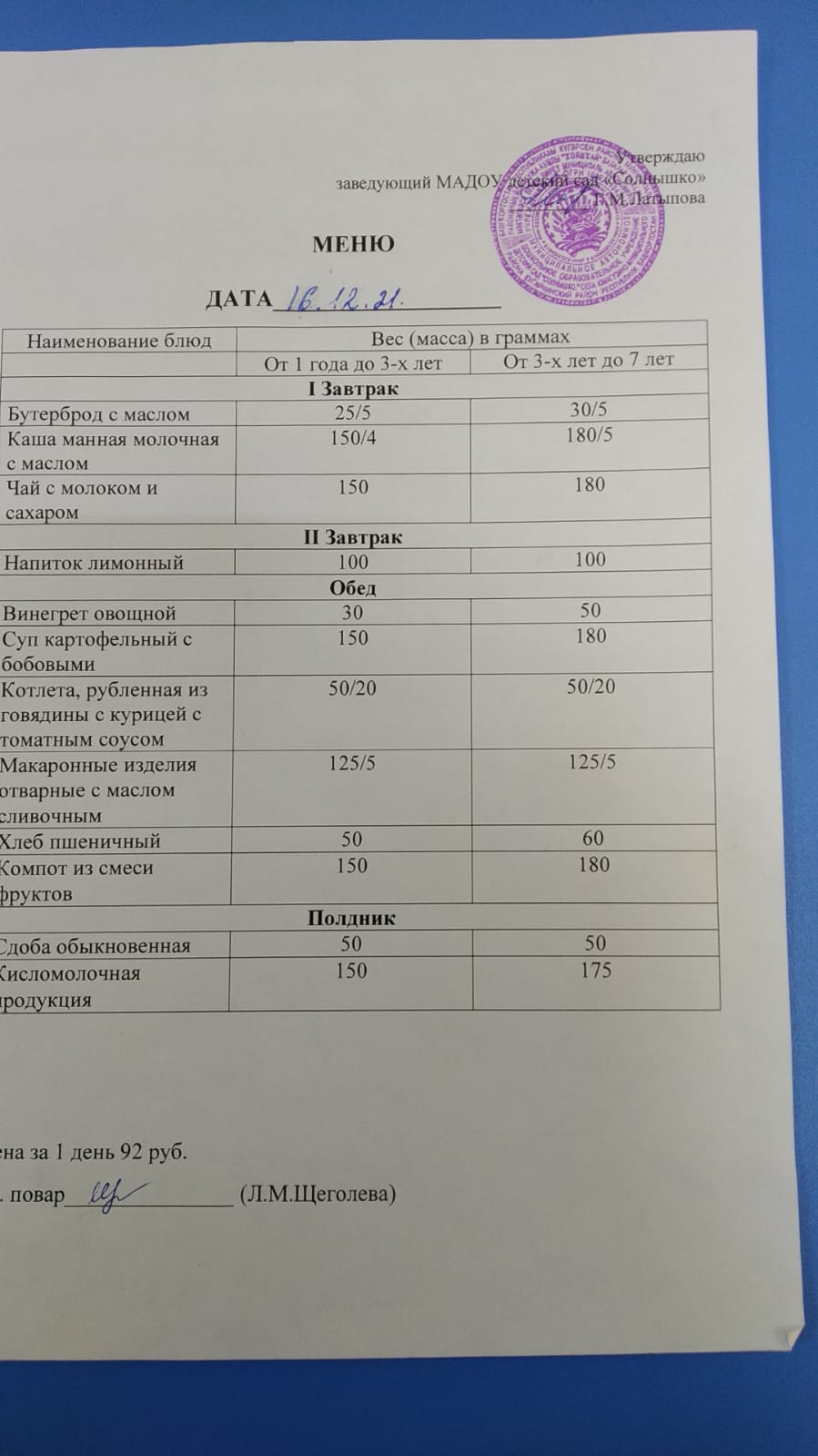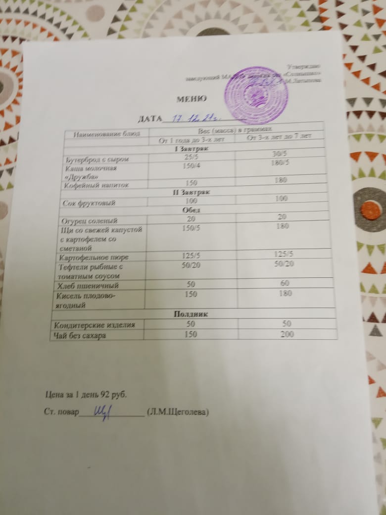 Организация питания в МАДОУ детский сад «Солнышко» с. Юмагузино