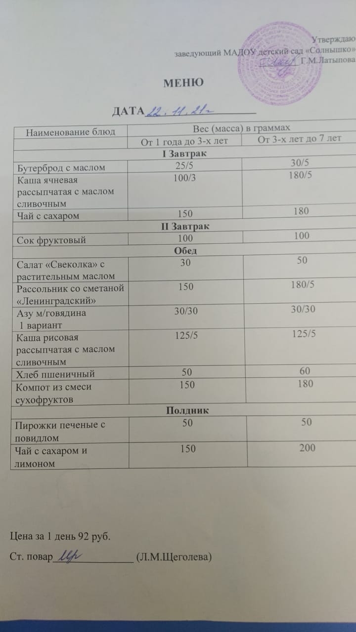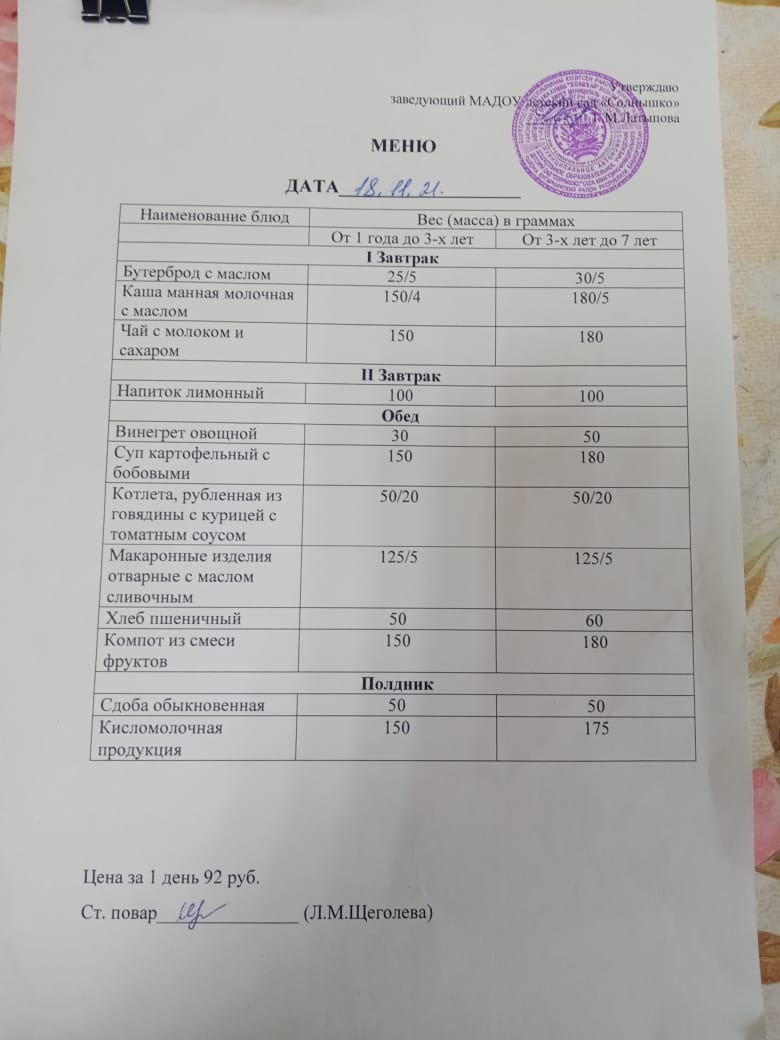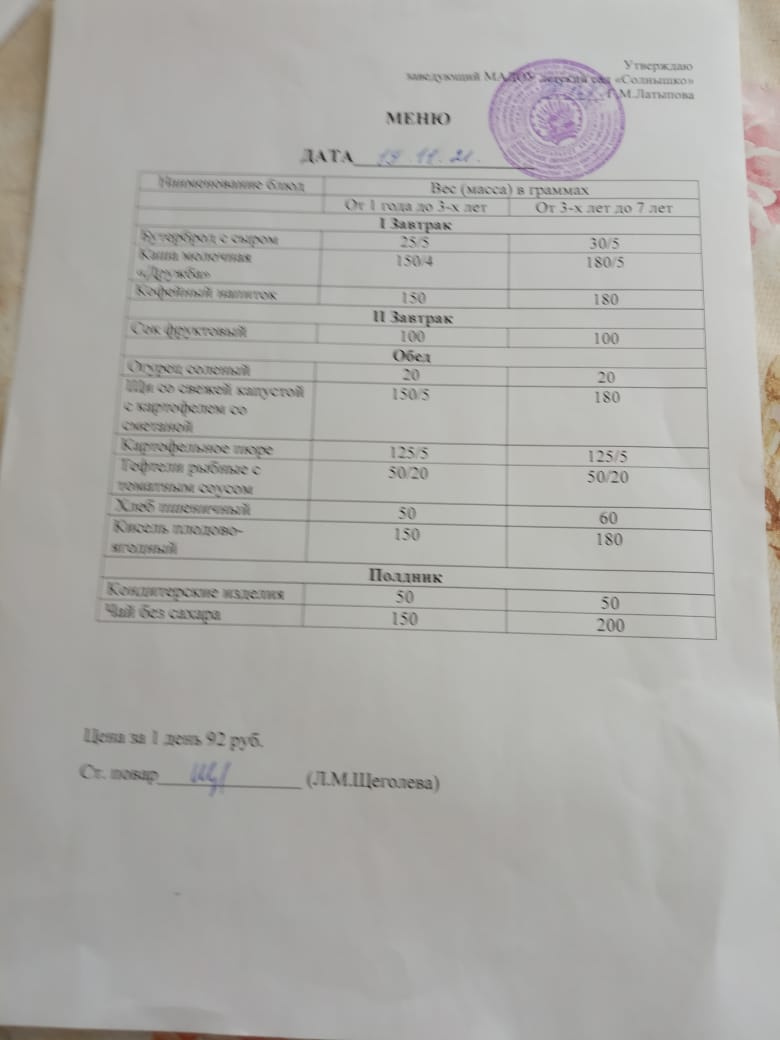 Организация питания в МАДОУ детский сад «Солнышко» с. Юмагузино