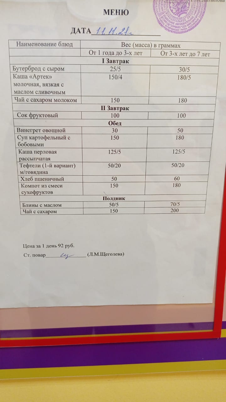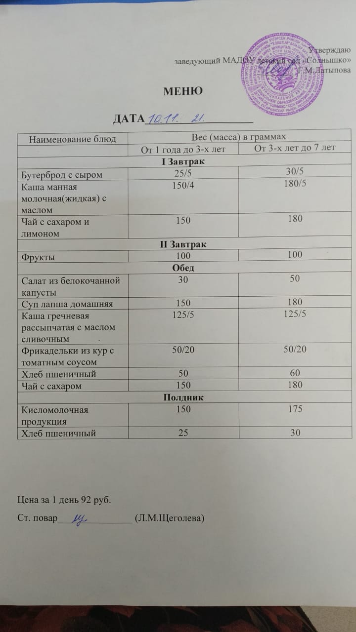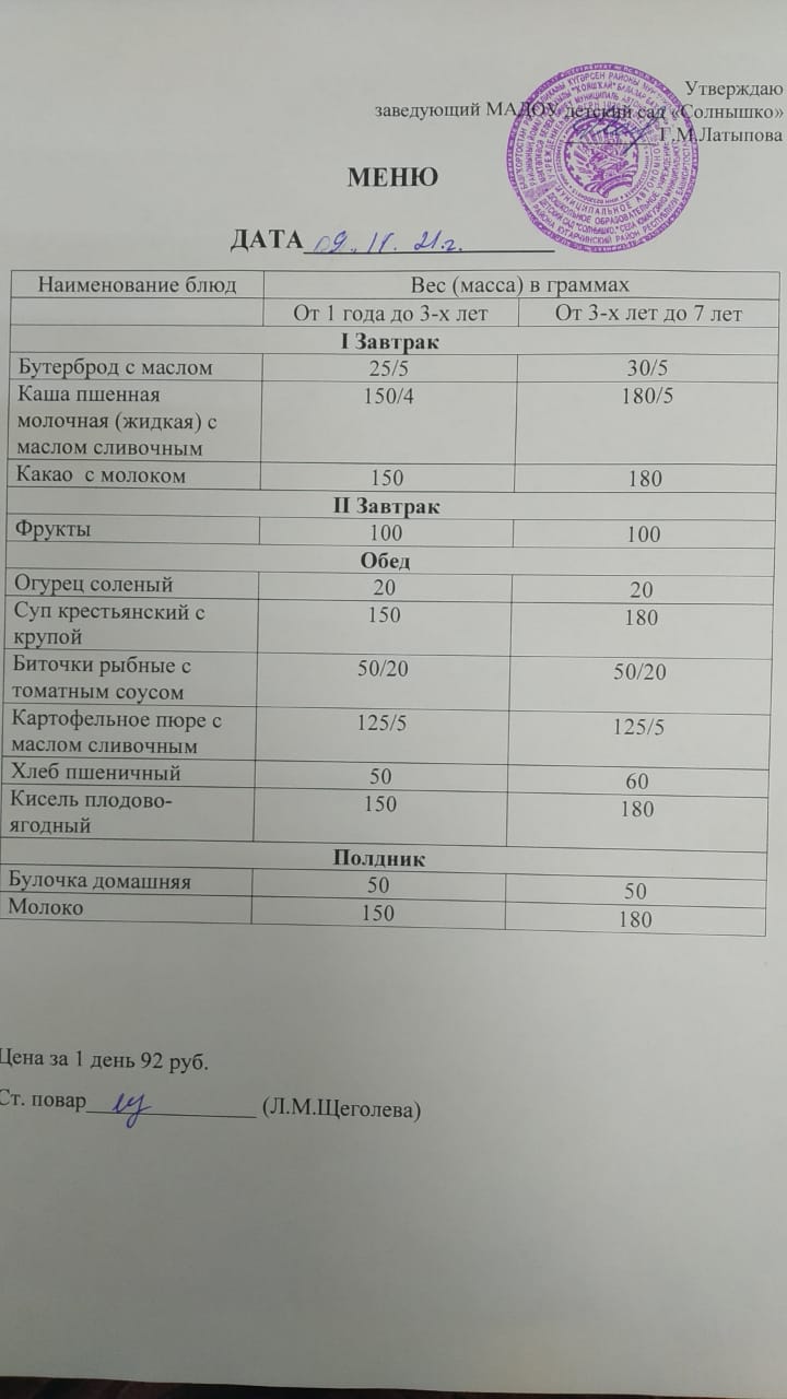 Организация питания в МАДОУ детский сад «Солнышко» с. Юмагузино