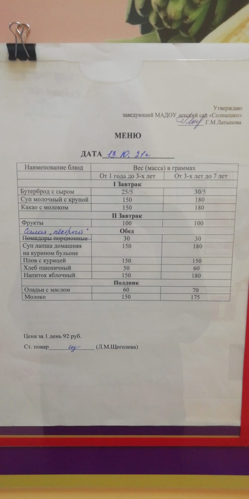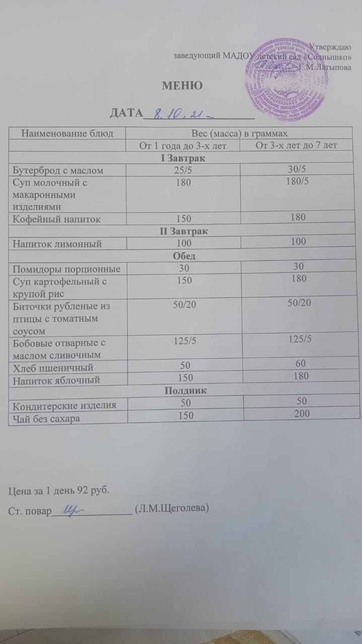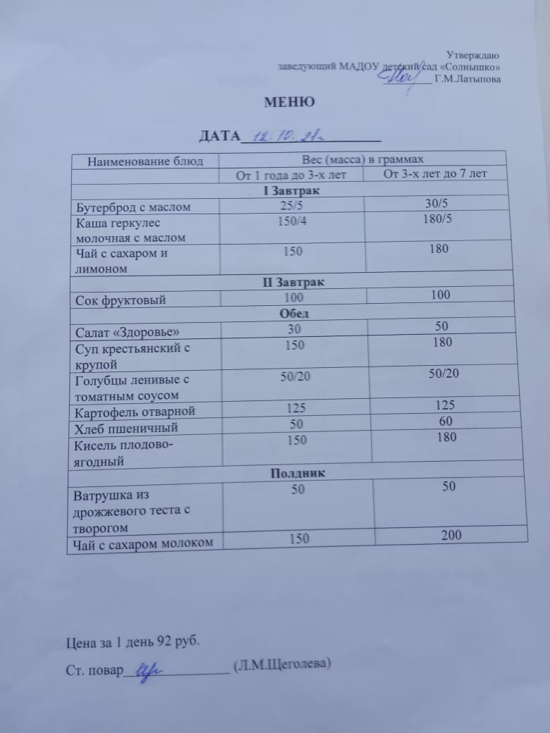 Организация питания в МАДОУ детский сад «Солнышко» с. Юмагузино