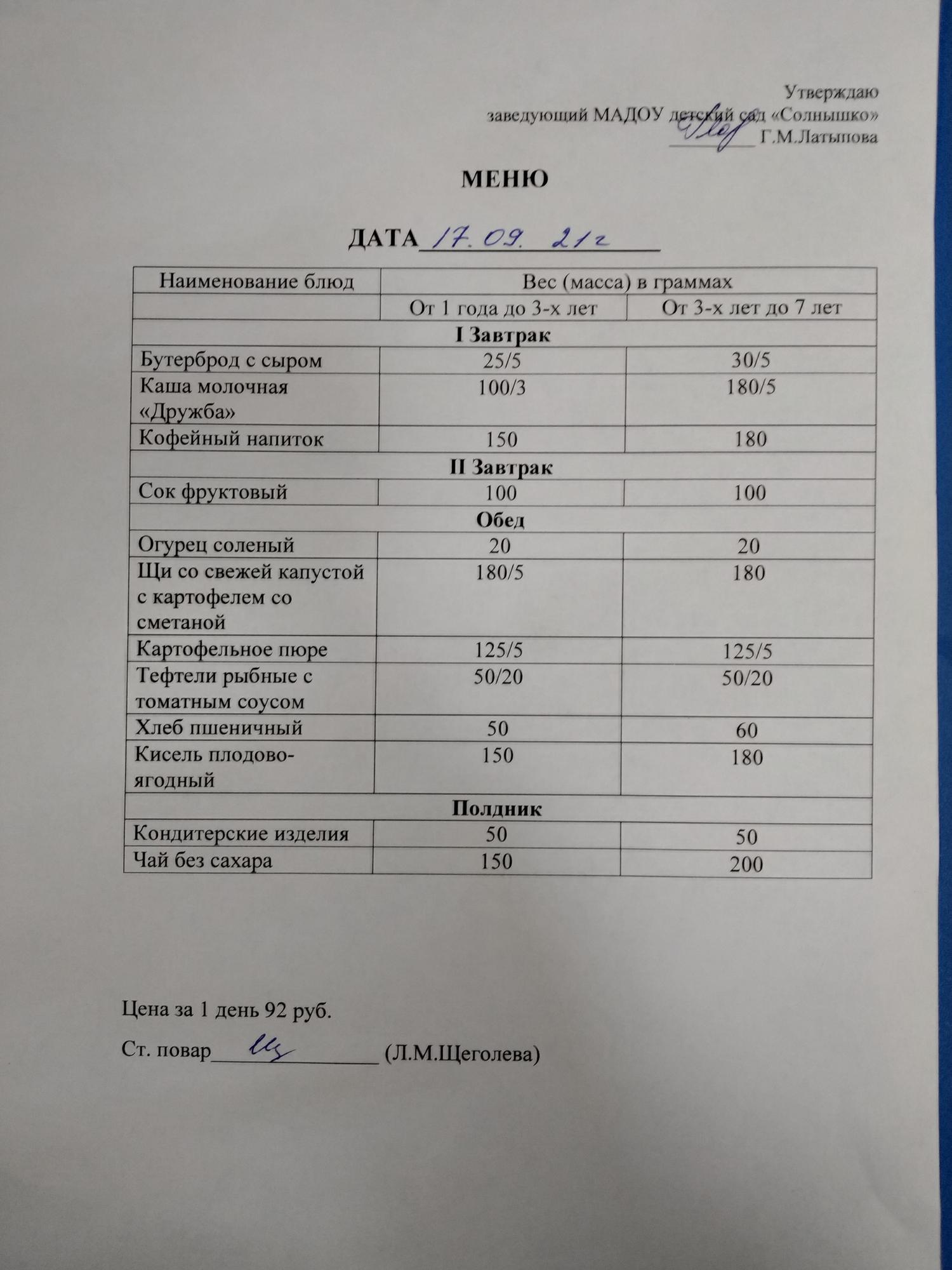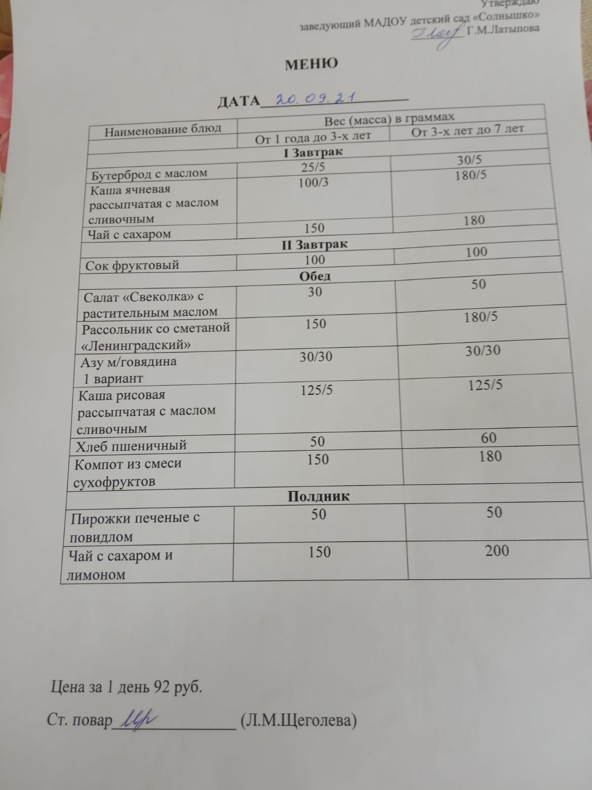Организация питания в МАДОУ детский сад «Солнышко» с. Юмагузино