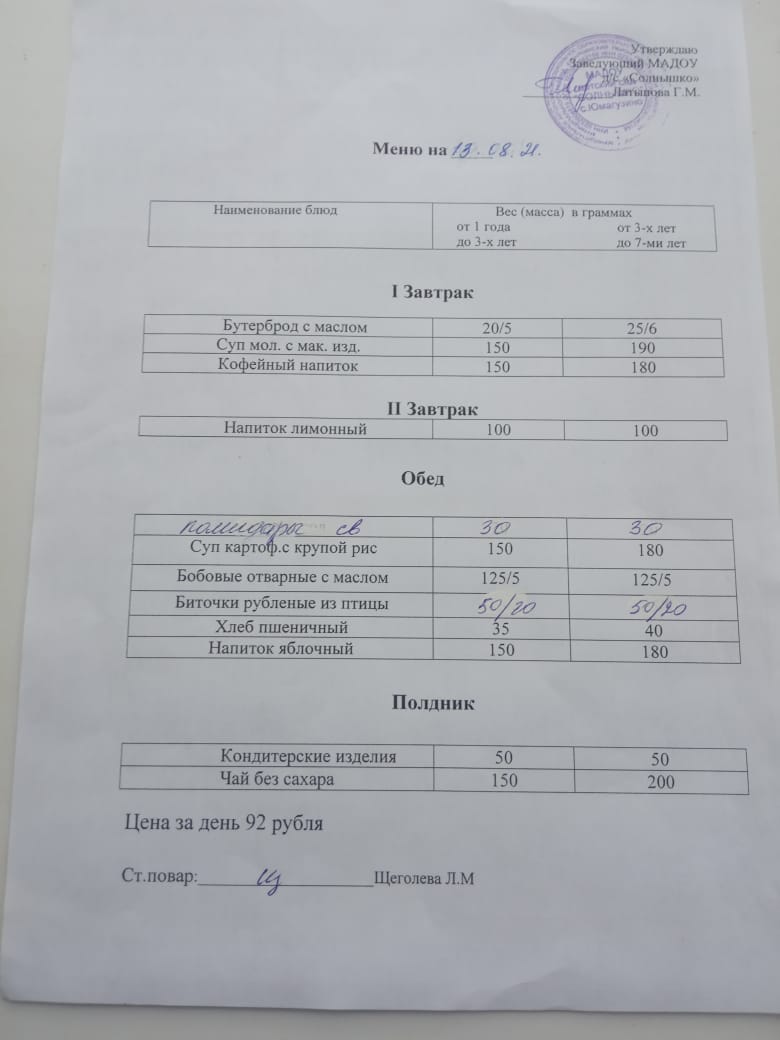 Организация питания в МАДОУ детский сад «Солнышко» с. Юмагузино