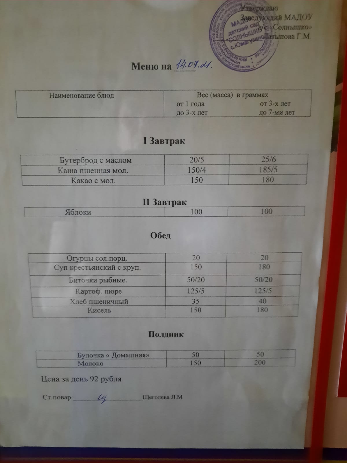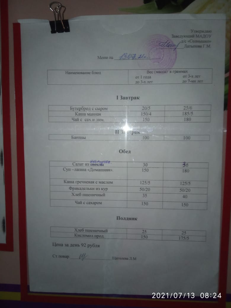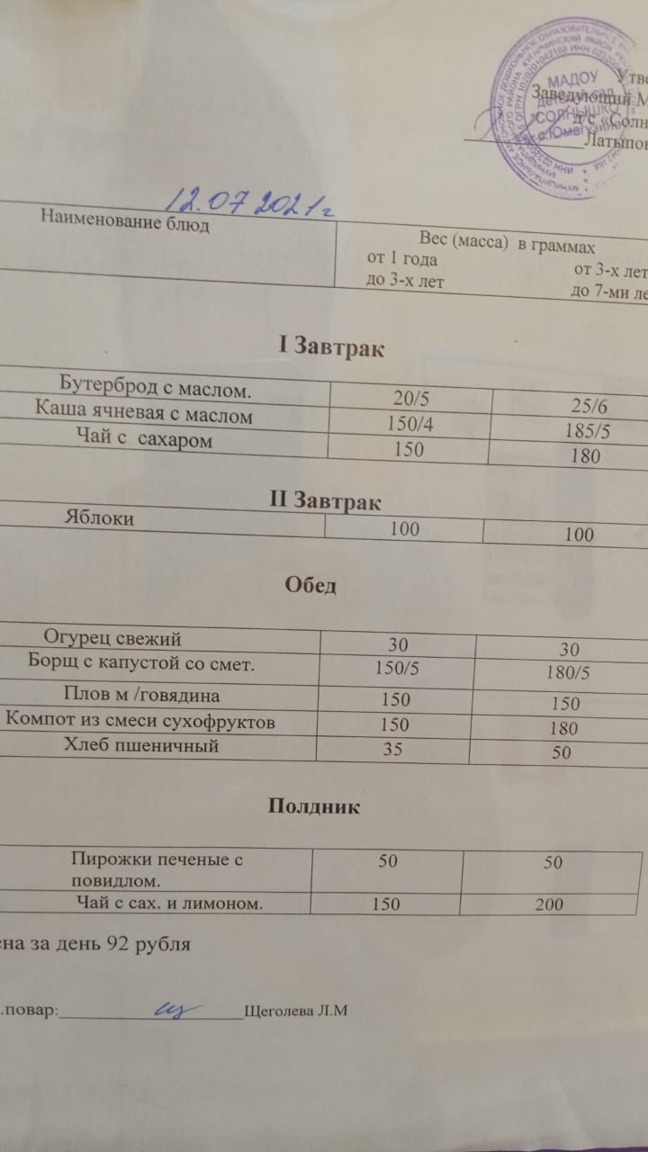 Организация питания в МАДОУ детский сад «Солнышко» с. Юмагузино