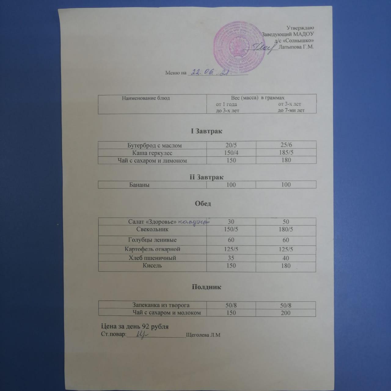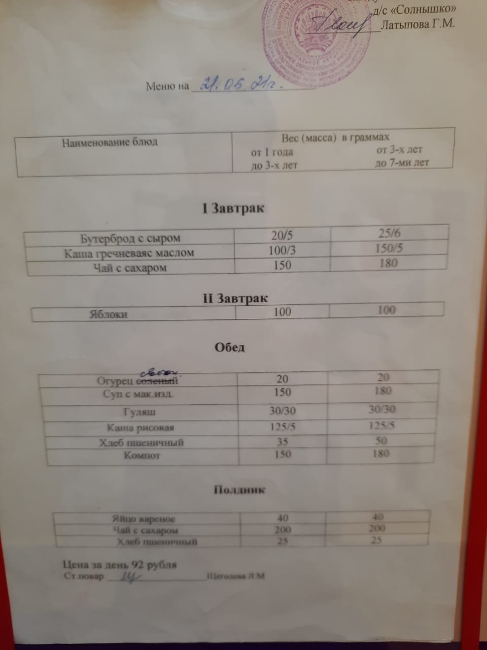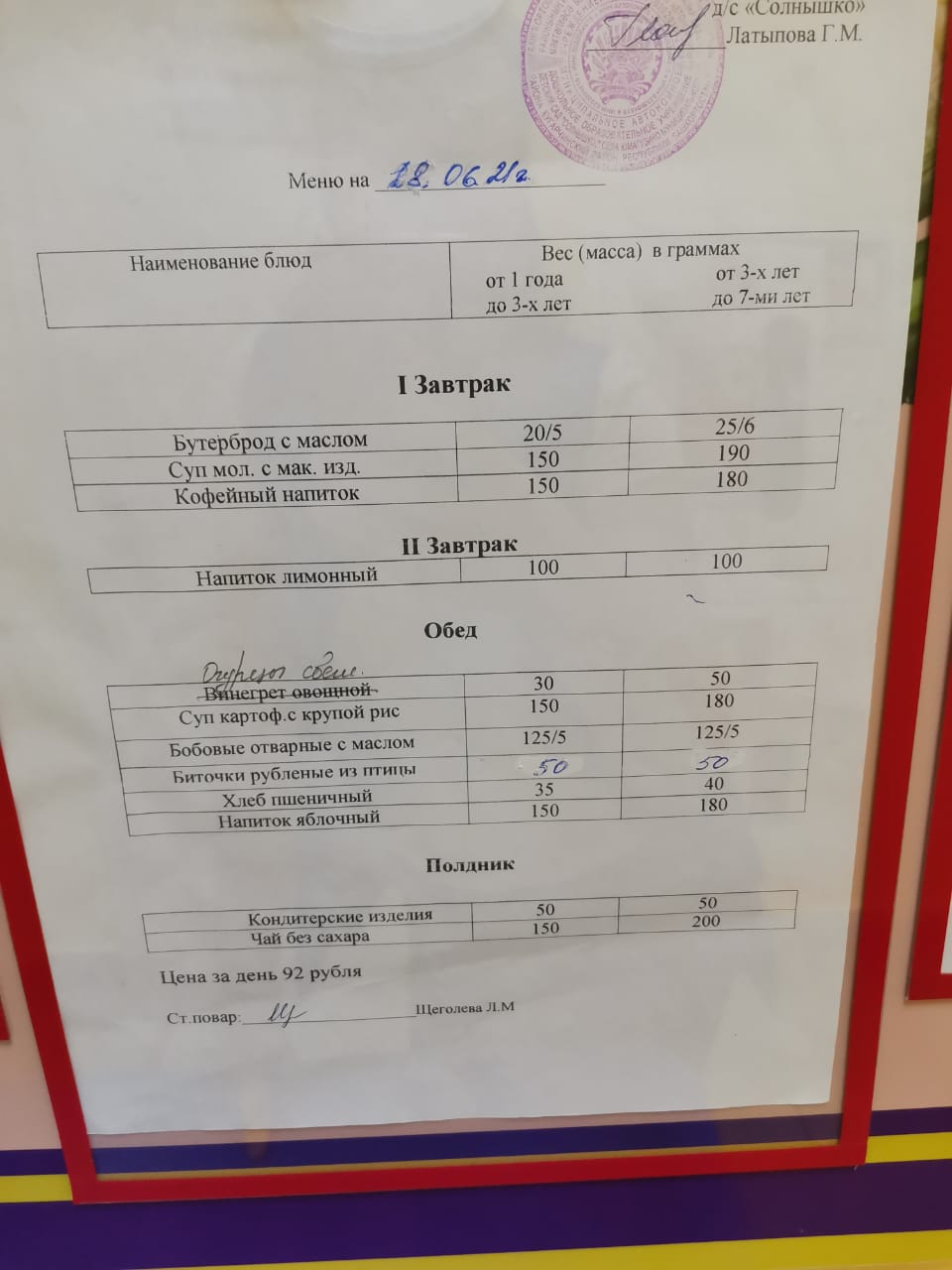 Организация питания в МАДОУ детский сад «Солнышко» с. Юмагузино