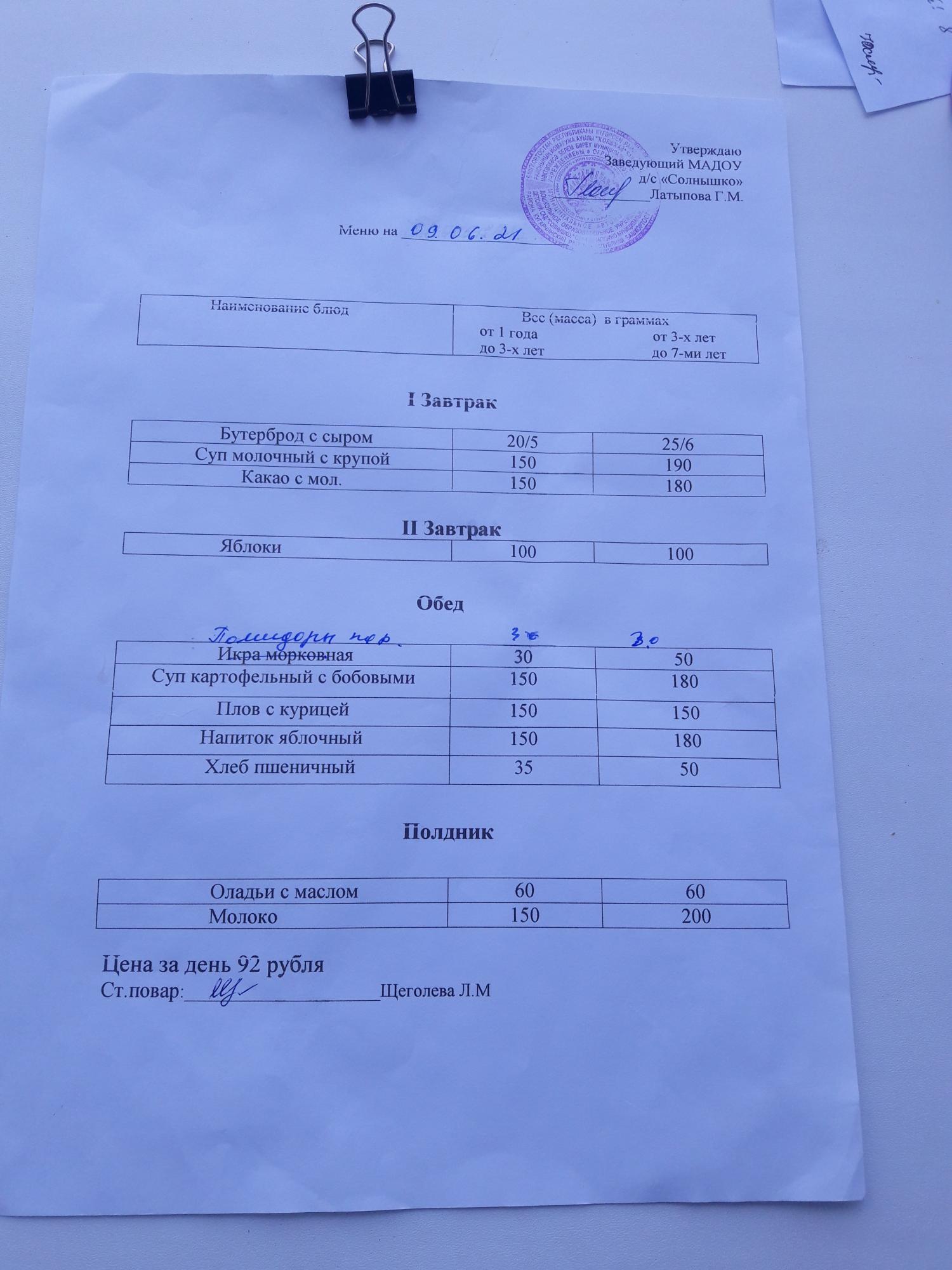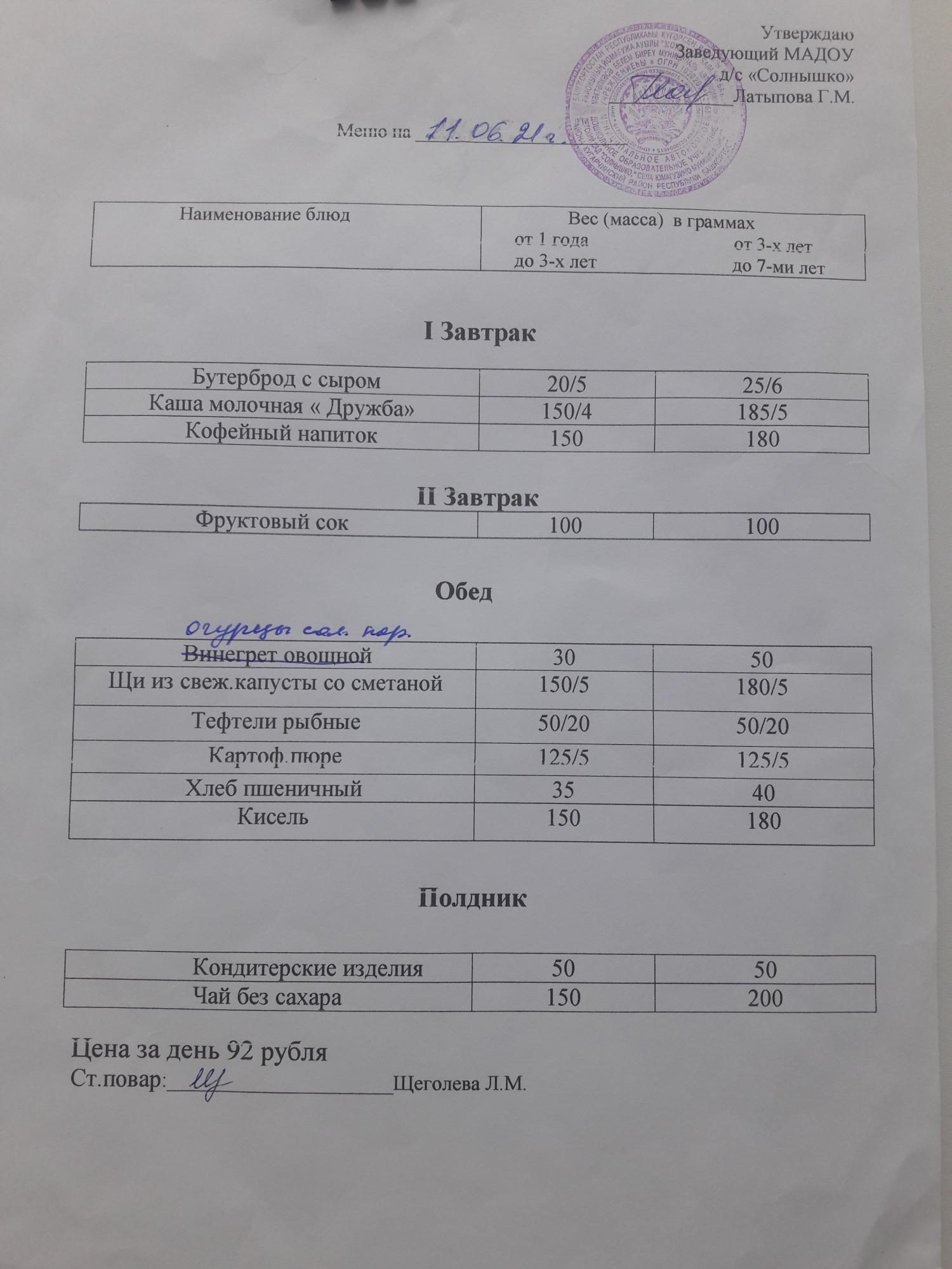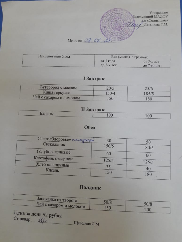 Организация питания в МАДОУ детский сад «Солнышко» с. Юмагузино